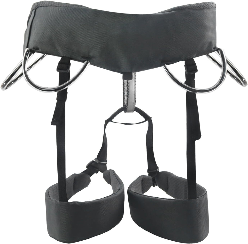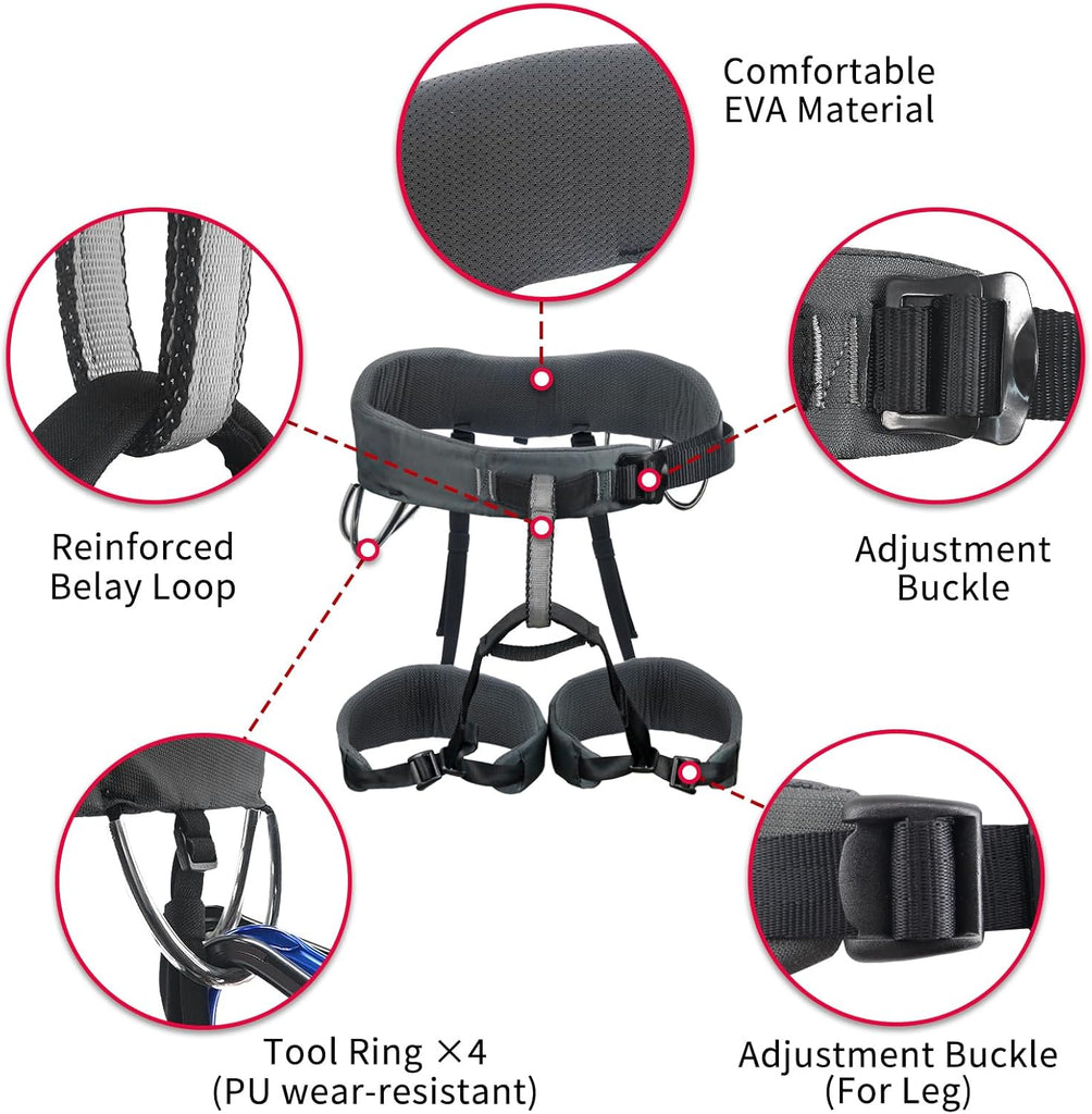 • [TOOL RING]:There is 4 tool ring on the right side of the rock climbing Harness, which makes it so easy to carry more climbing rope, chalk bag, belay device or other tree climbing gear rappelling gear. Two steel Adjustable Wait and Leg buckles allow waist belt to be adjusted and secured in a single movement.