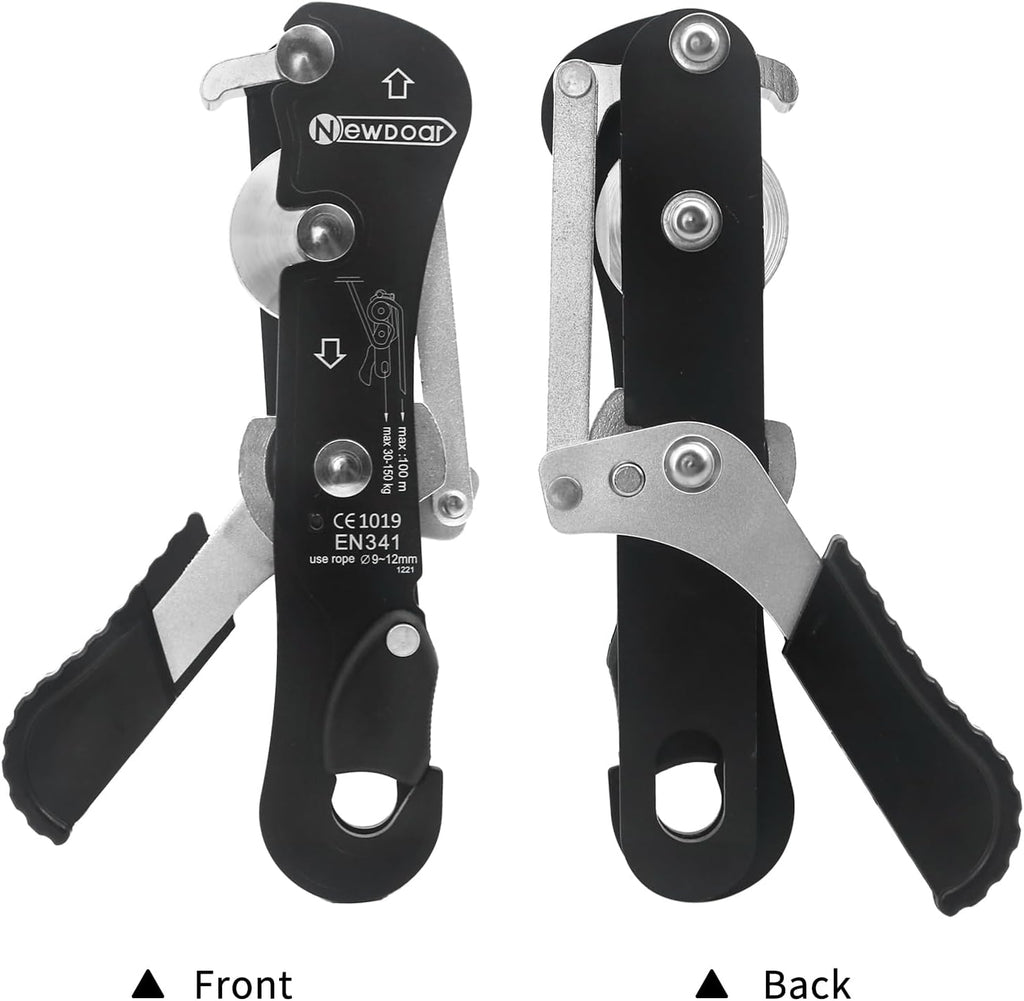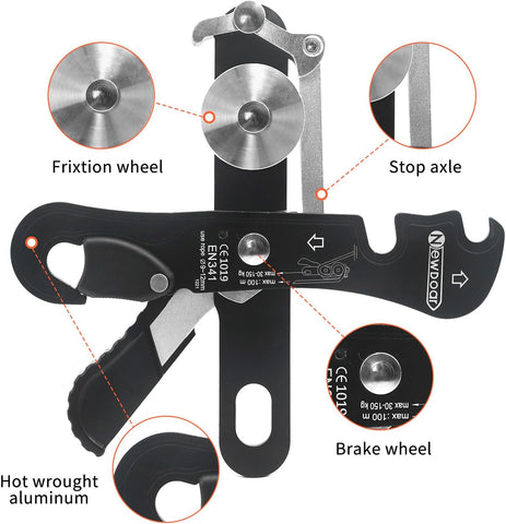 [Functional]: Design makes it good for descending tight passages,suitable for teach use.Self-breaking function allows you to easily stop and hold your position on rope. stop wheel is connected to the lower handle and the stop wheel through the connecting rod. The handle strength can control the descending speed, and the lock is locked when the grip is released or released.