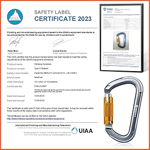 [CE UIAA Certified]: These Carabiner are made from7075 aviation aluminum material, which is super strong and portable. CE EN 12275:2013 & UIAA 121 QUALITY GUARANTEED! keep you safe and can stand 28KN (approx. 6180 LB force) pull force and up.