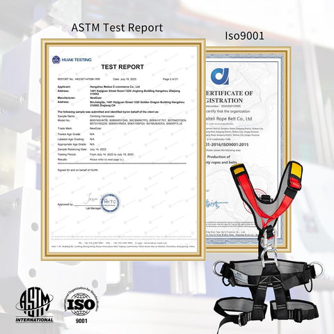 [MATERIAL]:CE 1282 EN353-1:2002.Weight limited : 800 KG. Maximum Breaking Strength: 22KN. Climbing Harness Made from polyester webbing with a reinforced tie-in point and stitching.