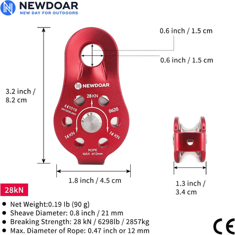 [Specification] 1.77 inch(4.5cm)*3.2 inch(8.2cm),The maximum load up to 28kN /6298 lb,Net Weight:0.19Ib(90g),Sheave Diameter: 0.8 inch / 21 mm.